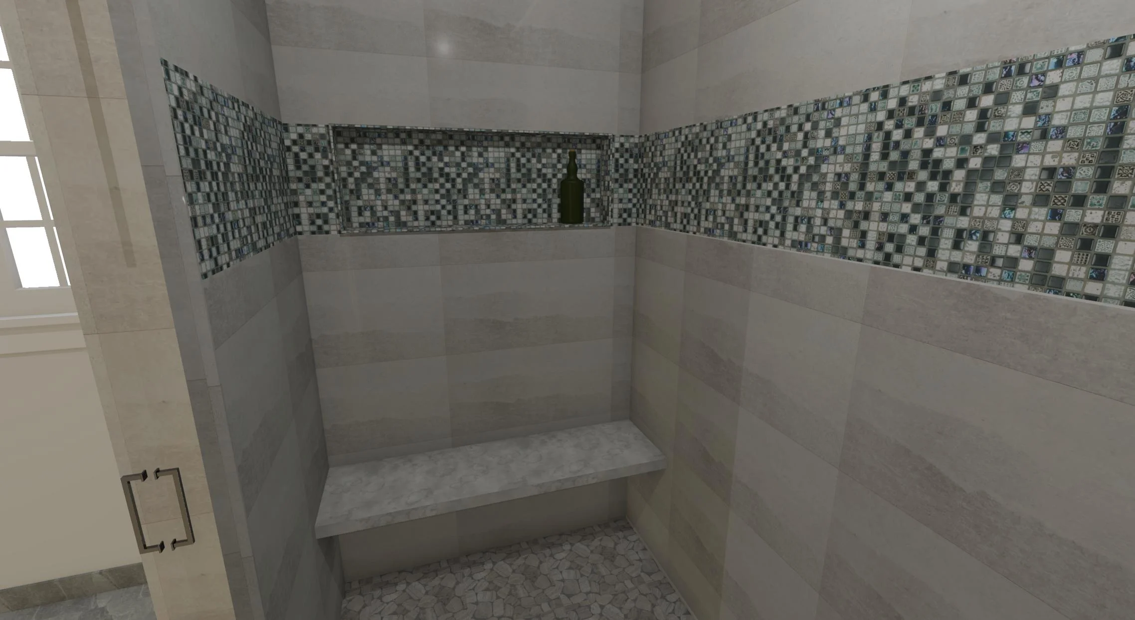 Custom Shower with Floating Quartz Bench, Imported Mosiac Tile Accent Band, Custom-Made Colored Glass Door Jambs and Shower Door, Custom-Made Colored Glass Niche, Rectangular LED Lighting, Pebble Tile Floor, Square Bronze Shower Drain