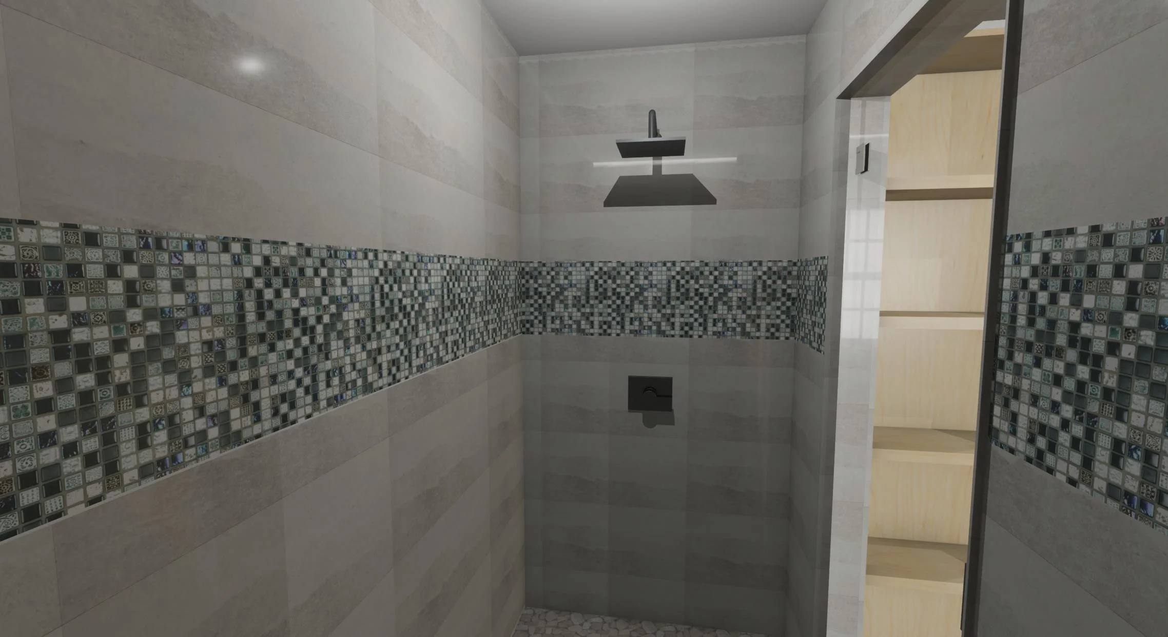 Custom Shower with Floating Bench, Tile Accent Band, Chrome Schulter Quadec Door Jambs, No Shower Door! , Custom-Made Colored Glass Niche, Recessed LED Lighting, Mosiac Tile Floor, Square Chrome Shower Drain